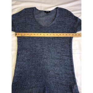 Size on tag is medium. Please see measurements in photos. Lighter weight knit. Perfect for layering over a cami or tank or even over a bathing suit. Tunic length a little longer in the back. Has side slits. Color is kind of a denim blue. Acrylic nylon blend.