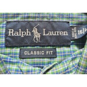 The Ralph Lauren Classic Fit Button Up Shirt in size 16L is a timeless piece perfect for casual occasions. Made from comfortable cotton material, this green and blue multi plaid shirt features a classic collar with button closure and long sleeves. With a regular fit and machine washable design, this shirt is both stylish and easy to care for, making it a versatile addition to any man's wardrobe. Perfect for the winter, fall, and spring seasons, this Ralph Lauren shirt embodies a classic theme with a touch of modern style.