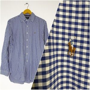 Ralph Lauren shirt, classic fit, gingham check, blue check shirt, button-down collar, polo embroidered shirt, 100% cotton, men’s medium shirt, preppy style, timeless wardrobe essential