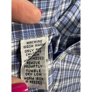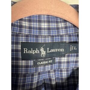 This Ralph Lauren Classic Fit Long Sleeve Pony Logo Button Down Shirt in size Large is a versatile and timeless addition to any man's wardrobe. Made from comfortable cotton material, this shirt features a classic collared neckline with button closure and embroidered accents. The plaid pattern in blue color offers a preppy and stylish look suitable for various occasions such as travel, weddings, parties, casual outings, work, and business meetings. With its easy care and all-season features, this shirt is perfect for year-round wear.
