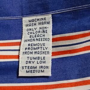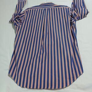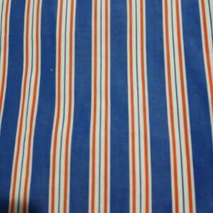 This long-sleeved shirt features a blue, orange, and white striped pattern.