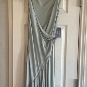 This beautiful gown is perfect for any special occasion. Sleeveless dress has a v neck and is gathered on the bodice side. Fitted through the torso and draped at the hip, the skirt wraps with a deep ruffle hem. Closes at the side with a zipper & a hook & eye. Butterfly pin at waist. The bodice is lined, there is an interior grosgrain ribbon band at the waist with bar hooks to adjust. The skirt is unlined.
