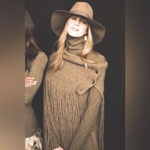 Cascading fringe, crafted with deliberate unruliness, evokes the spirit of the wild west while maintaining the refined elegance of an Upper East Side soirée. Hand-knit cable detail sweeps across the fabric, merging rustic charm with urban polish.