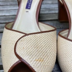 These Panama straw and brown leather heels (retail $550) have an approximate 3.5 in heel height and are lightly worn (minor toe scuffs, small yellow mark on front of right shoe, and buckle on left shoe is slightly loose).