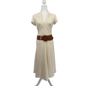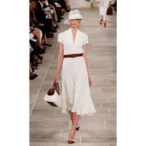Step into timeless elegance with this rare Ralph Lauren Purple Label runway dress from Spring 2009, famously worn by Sarah Jessica Parker SJP as Carrie Bradshaw in Sex and the City. Crafted from luxurious 100% silk with a soft ivory off white hue, this iconic dress features a softly structured collar, fluid skirt, and discreet pintuck pleating at the bodice.