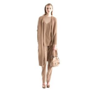 This cardigan is the perfect blend of oversized slightly slouchy and yet clean lines with exaggerated ribbed knit cuffs, bracelet length sleeves, buttery soft camel cashmere, silk, mohair blend in a gorgeous chunky knit.