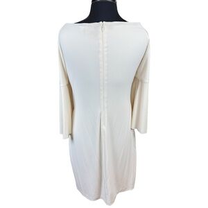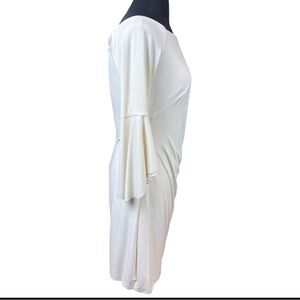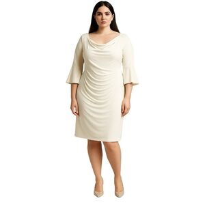 Meet Grace — your go-to neutral for effortless elegance. This Ralph Lauren Green Label sheath dress features a flattering ruched front and soft bell sleeves that add just the right amount of movement. The ivory tone and luxe fabric feel offer a timeless, demure presence that shines in settings where quiet luxury speaks louder than flash. Whether styled for bridal events, evening gatherings, or elevated dinners, she brings a sense of calm sophistication. The back zip keeps the silhouette clean, while the flattering draping on the front adds soft dimension.