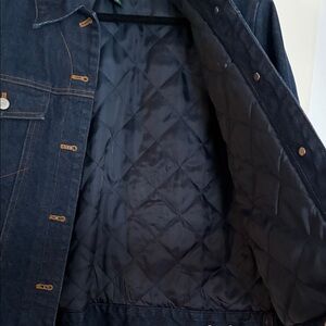 Stylish dark blue denim jacket with button closure. Features classic design with front pockets. Quilted lining