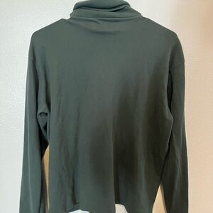 Stylish dark green turtleneck shirt. Features iconic logo on chest. Comfortable and versatile.