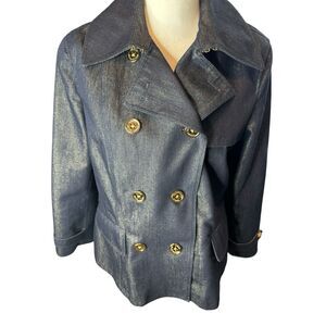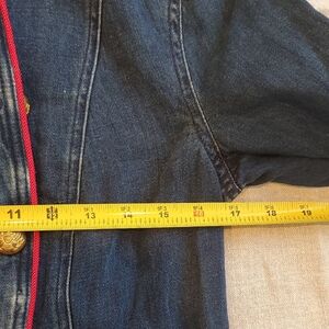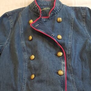 Double-breasted denim jacket. Features red piping and gold buttons. Stylish and versatile.