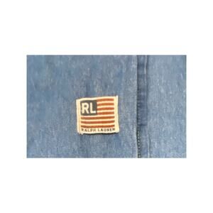 Vintage Ralph Lauren ruffled denim pillow cover in classic Americana style. Made in the USA from 100% cotton chambray denim with a soft, lightweight feel. Features a Ralph Lauren flag logo tag on the front and envelope-style back closure. Beautiful ruffled border adds a farmhouse, cottagecore, and rustic charm — perfect for vintage-inspired or country-style décor.