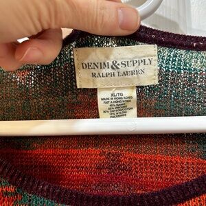 This Ralph Lauren sweater in size XL features an Aztec geometric design with a boat neck and boho style. It is a tight-knit pullover with long raglan sleeves, made of a blend of nylon, viscose, ramie, and cotton. The sweater is multicolored and lightweight, suitable for all seasons and occasions, including travel and casual wear. It has a Western, colorful, and bohemian theme, perfect for autumn, winter, and spring outings.