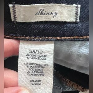 This is a pair of Ralph Lauren Denim & Supply jeans for women in size 28 with a low rise fit. The jeans are made from a blend of polyester, spandex, and cotton, featuring a dark wash denim fabric with a solid pattern. They have a skinny style with a 32-inch inseam and a 5-pocket design. The jeans are designed for comfort with stretch material and come with button and zipper accents, as well as the brand's logo. Made in Mexico, these jeans offer easy care and are suitable for everyday wear.