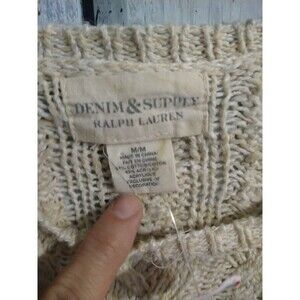 Elevate your wardrobe with this stylish Ralph Lauren Denim & Supply Cable Knit Sweater. The medium-sized sweater comes in a classic beige color and is made of high-quality cotton denim fabric. It features a crew neckline, long sleeves, and a solid pattern that makes it suitable for various occasions, including travel, party/cocktail, casual, workwear, and business.