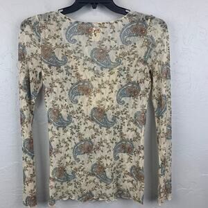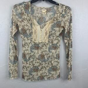 The Denim & Supply Paisley Top, in women's size Medium (M/M), offers a bohemian-inspired look with its cream-colored floral paisley print. This Henley-style shirt features delicate lace detailing, adding a touch of feminine charm. Its comfortable design makes it perfect for casual wear, embodying a relaxed yet stylish aesthetic.