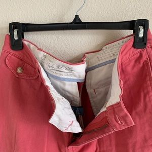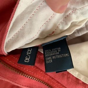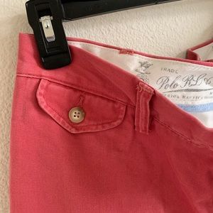 Red chinos from Ralph Lauren. Has some natural and designed distressed to them. The crotch area is in very good condition with very minor wear as shown in the picture. Pants are in overall good condition with no major damage or stains.
