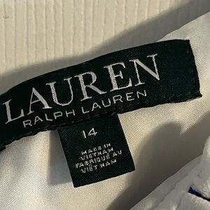 Lauren by Ralph Lauren Women's Cold-Shoulder Floral Dress Size 14 Embrace elegance with this stunning off-shoulder dress featuring a vibrant blue floral pattern on a crisp white background. Perfect for any occasion.
