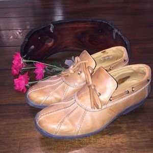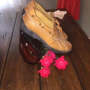 These duck booties are super cute and right on trend! High end Ralph Lauren, butter soft leather, made in Italy with Gommus traction soles. EUC worn less than 5 times (very small creases at bend in toe and two small spots of darkened leather from wear on inside only - pictured) I absolutely love these duck boots I just didn't wear them enough to justify them taking up space in my closet !