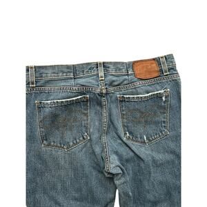 Vintage Ralph Lauren Blue Label “Dungarees” men’s jeans. Features medium wash, embroidered back pockets, leather patch, and a bootcut leg with frayed hems for a worn-in Y2K look.