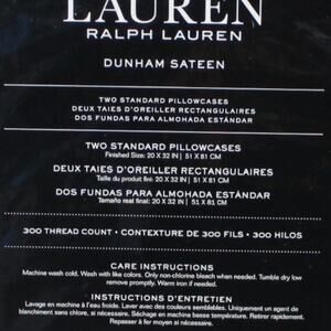 Add a touch of luxury to your bedding with this beautiful set of Ralph Lauren Dunham Sateen pillowcases. Made from 100% cotton with a 300 thread count, these pillowcases offer a soft and smooth feel for a restful night's sleep.