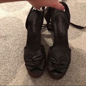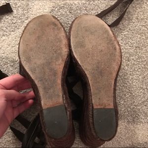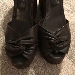 Cute dark brown leather espadrille tie wedges from Ralph Lauren Collection. Pre owned, signs of wear on sole, leather and wedge, shown in the pics. 4.5" wedge heel.