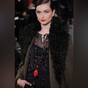 Simply luscious, and utterly chic runway coat. In perfectly neutral tones, of a subtle olive plaid that will pair well with other patterns. Brown effect of olive, tan, rust, and purple fibers. The fur is deep-deep brown, soft, and wavy. The body is a resilient winterweight, that will keep you warm and cozy.