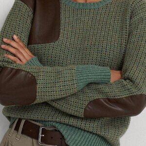 Lauren Ralph Lauren women’s [black label] brown faux leather shoulder and elbow pads on a green and blue color blocking wool blend semi crop modest neckline sweater features ribbed hem and cuffs