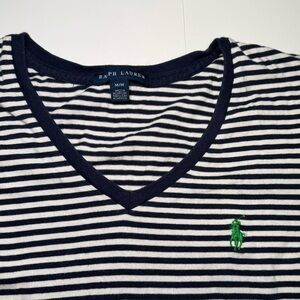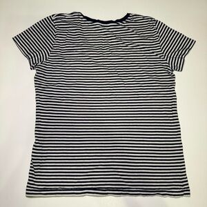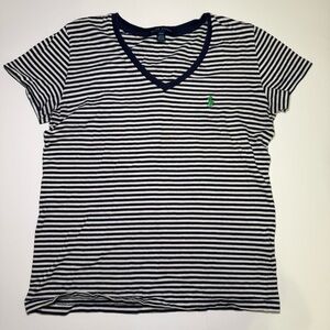 This fitted top features a classic black and white stripe pattern, offering a timeless and versatile look. The short sleeves and soft, stretchy fabric ensure comfort and style for any casual occasion. The v-neckline is accented with a sleek black trim, adding a touch of elegance to this essential wardrobe piece.