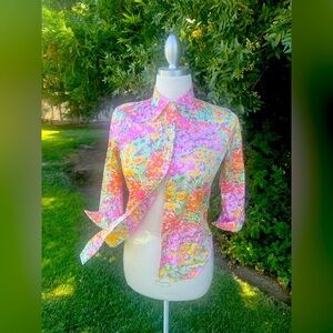 Vibrant floral button down shirt. Features pink, yellow, and green hues. Classic collar and button cuffs. Perfect for a stylish look.( pit2pit 19” length 25” approximately) 3/4 sleeves