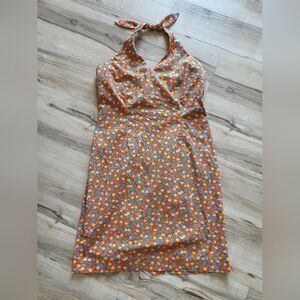 Beautiful Floral Spring Summer Print Dress Ties around the neck zips up the back. Split on the back was ripped up a little like it was stretched not a major flaw but worth noting.