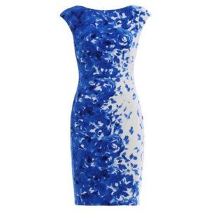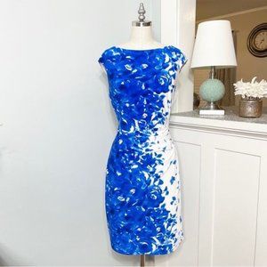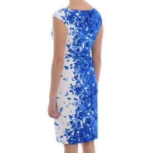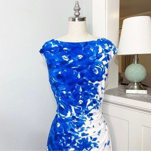 Ralph Lauren Blue White Floral Jersey Sheath Dress Career Office Professional Formal Event Holiday Cocktail Party Date Night Out Church Coastal Spring Summer Wedding Guest