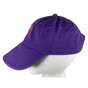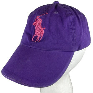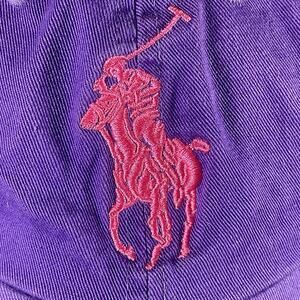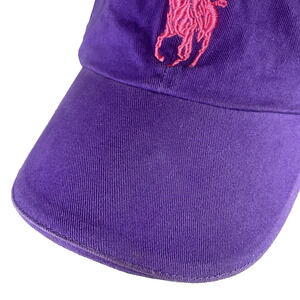 Ralph Lauren Fragrances Purple Hat Sporty Cap Big Pink Pony Strap Back. Embroidered pink polo man/horse on front, yellow no. 4 on side and spell out in yellow "Ralph Lauren Fragrances" on back. Baseball style cap. Pre-owned condition. Fairly clean with some light wear. There is a very faint fade spot on to of the bill and a dark spot on bottom of bill's edge. Review photos carefully for all design & condition details.