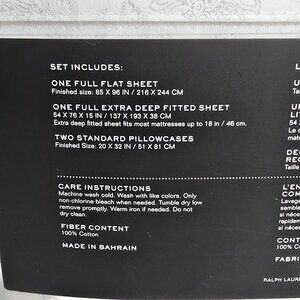 includes: One Full Flat Sheet (85 x 96 in), One Full Fitted Sheet (54 x 76 x 15 in, Fits Up to 18" Mattress) and Two Standard Pillowcases (20 x 30 in)