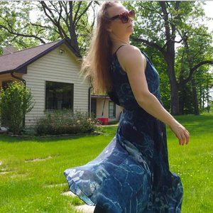 Luxury fashion & independent designers | SSENSE Genuine Silk Georgette Maxidress - Polo Ralph Lauren Maxi Flare Lined Cobalt blue sea deep blue navy Abstract Floral print on textured crepe silk dangle metal work pulling weights beads on long decorated straps. Waistline and neckline can be styled multiple ways due to all cinch and pull, drop waist or high waist, tight or oversized, deep V-neck or fully draped closed front or back - the sky is the limit to this gorgeous boho dress. Its movement is like a blue hazed Coastal dream passing by too fast inprinting in memory its cobalt blue!