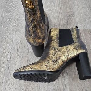 Keywords: Ralph Lauren, Gold boots, Metallic boots, Ankle boots, Heeled booties, Pointed toe boots, Chelsea boots, Womens boots, Fashion boots, Designer boots, Party boots, Evening boots, Fall boots, Winter boots