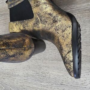 Gleaming allure defines these stunning ankle boots, ready to elevate any ensemble with a touch of edgy elegance. The striking gold metallic finish catches the light, creating a captivating visual texture. Classic Chelsea boot styling with elastic side panels ensures a comfortable and secure fit, while the sleek pointed toe and block heel add a modern, sophisticated silhouette. These boots are perfect for adding a bold statement to a night out, dressing up a casual brunch, or adding an unexpected twist to office attire.