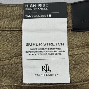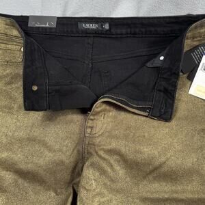 Metallic gold Lauren Ralph Lauren high-rise skinny ankle jeans in size 18 with super-stretch shape-memory denim that hugs and smooths. New with tags and perfect for holiday outfits, night-out looks, or adding a bold statement piece to your wardrobe. New with tags. Due to light and screen difference, the color may be slightly different from the picture.