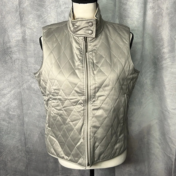 Ralph Lauren gold and silver quilted fully reversible vest with zip front and four snap neck. Size petite large. Tiny spot on silver side right next to the zipper about 7.5” up from the bottom. Small spots on gold side a few inches up from the bottom. Might come out with a wash. I haven’t tried. In otherwise lovely preowned condition! Measurements taken when vest is lying flat and are approximate.