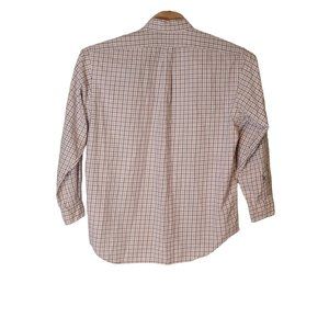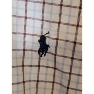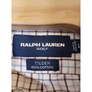 Classic Ralph Lauren Golf Flannel Cotton Button Down Long Sleeve Shirt in a white, blue, and brown plaid design. Perfect for a casual day on the golf course or a night out. Size Large.