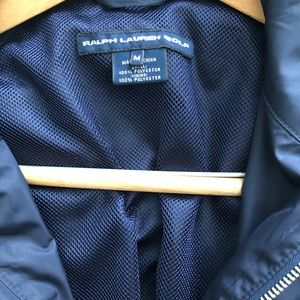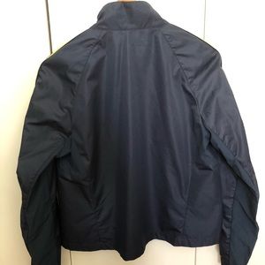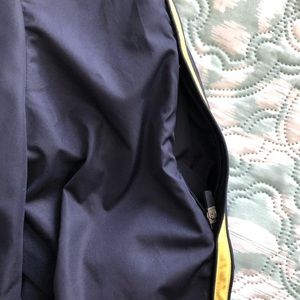 Light weight, royal navy color with yellow stripes on arms. 2 pockets in front and one arm pocket. I wore it once or twice but too small for me.
