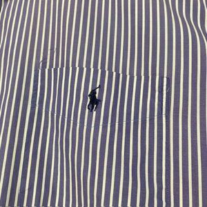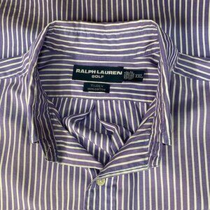 Elevate your golf game with this stylish Ralph Lauren Golf shirt. The purple striped cotton shirt features a collared neckline and short sleeves, perfect for a day on the course or a casual outing. The button-down closure adds a touch of sophistication, while the embroidered accents and colorful stripes make it a designer statement piece. This men's XXL shirt is machine washable and made with high-quality woven fabric, ensuring both comfort and durability. Whether you're dressing up for a business meeting or keeping it casual for a day out, this Ralph Lauren Golf shirt is a versatile addition to any wardrobe.