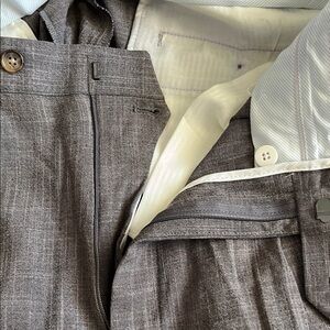 These Ralph Lauren dress pants in a sophisticated gray hue feature a classic straight-leg design with pressed creases for a polished look. Crafted from a high-quality wool-blend fabric, they offer a subtle texture that enhances their formal appeal. Ideal for business or formal occasions, these pants are a timeless addition to any wardrobe.