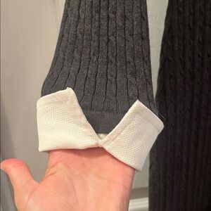 Chic black knit dress. Features white collar and cuffs. Long sleeves for a classic look.