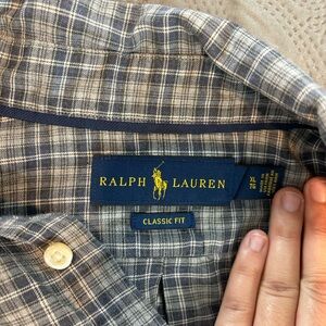 Ralph Lauren Men Grey Plaid Shirt with Logo at the front.Classic Fit, Button Down Shirt with Long Sleeves.In Great Condition Gently Used. 100% cotton. Perfect for casual outfits or any special occasions.