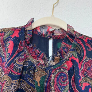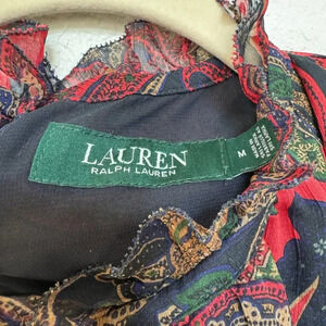Ralph Lauren High Neck Paisley Sheer Ruffle Lightweight Blouse Pink Blue Brown M
