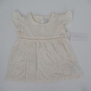 Top: A-line silhouette; "RL" embroidered script at the right hem; lace trim at the rounded neckline; buttoned back placket; short flutter sleeves; inset lace trim throughout; shirred front and back yoke