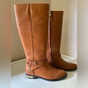 Boot season is here! Beautiful burnished leather riding boot in polo tan color by Lauren Ralph Lauren. Featuring a full length inside zipper, a decorative strap and a gold-tone L. R. L initial heel plate for subtle prestige. If you’re looking for a classic riding style boot this is it.