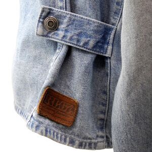 Ralph Lauren Jeans Co RL67 jean jacket, women's size Large. Light blue wash denim with five-button front with silver tone riveted buttons embossed with Lauren Jeans Co Est 1967. Tan corduroy collar, long sleeves with tan corduroy cuffs and adjustable two button closure. Two front chest pockets with flaps and button closures; two hand pockets. Side button tabs shown in close-up picture. Leather RL 67 logo on lower right side by tab. 100% Cotton; Machine wash.