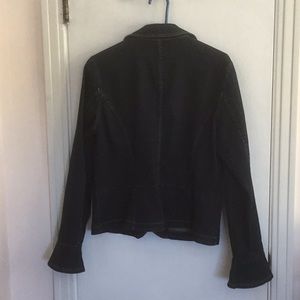 Fun jacket in 92% cotton, 7% polyester, 1% elastase. Features a peplum and flared sleeves. Functional front pockets are still sewn shut. In great condition from smoke free home.