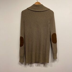 Dark green collared long knit cardigan. Has brown suede elbow pads. A classic dark academia sweater. I believe it is a men's small but it also is cute as an oversized women's cardigan. In excellent condition.